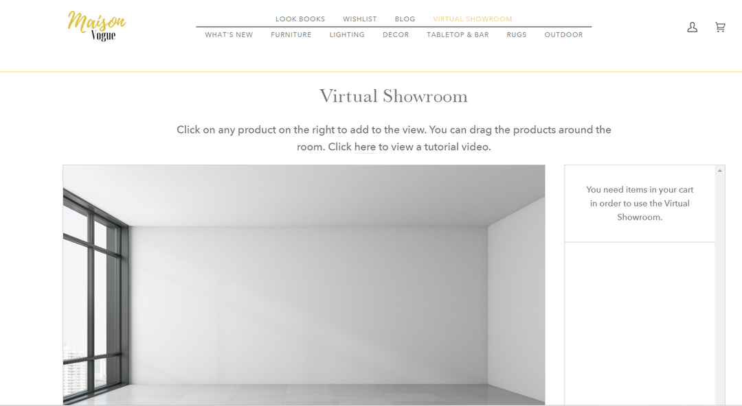 Be your own Designer, using our Virtual Showroom, you can upload a photo of any space and use any product from Maison Vogue to view directly in your room! Create a Mood board, or stage a room. You can even see if the products work in your space before purchasing! Check it out!